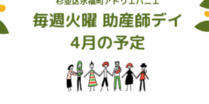 毎週火曜日、杉並区の永福町北口商店街中ほどにあるアトリエパニエにて「助産師デイ」と称して、妊婦さんからご家族も含めて参加できる講座や、子育てひろばを行っています。1ヶ月検診後からのスキンシップクラス、だっことおんぶの講座、手づかみ食べ講座、赤ちゃんからの性の話、アーユルヴェーダ的子育て、赤ちゃんと大人の足のクラス・・・などなどわいわい話しながら、子育てをみんなで語る場を運営しています。